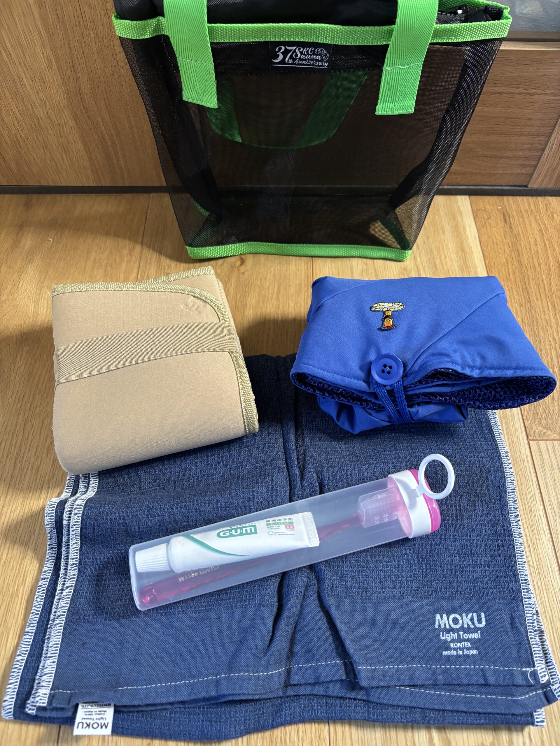 MOKUタオル、サウナハット、歯ブラシケース。
